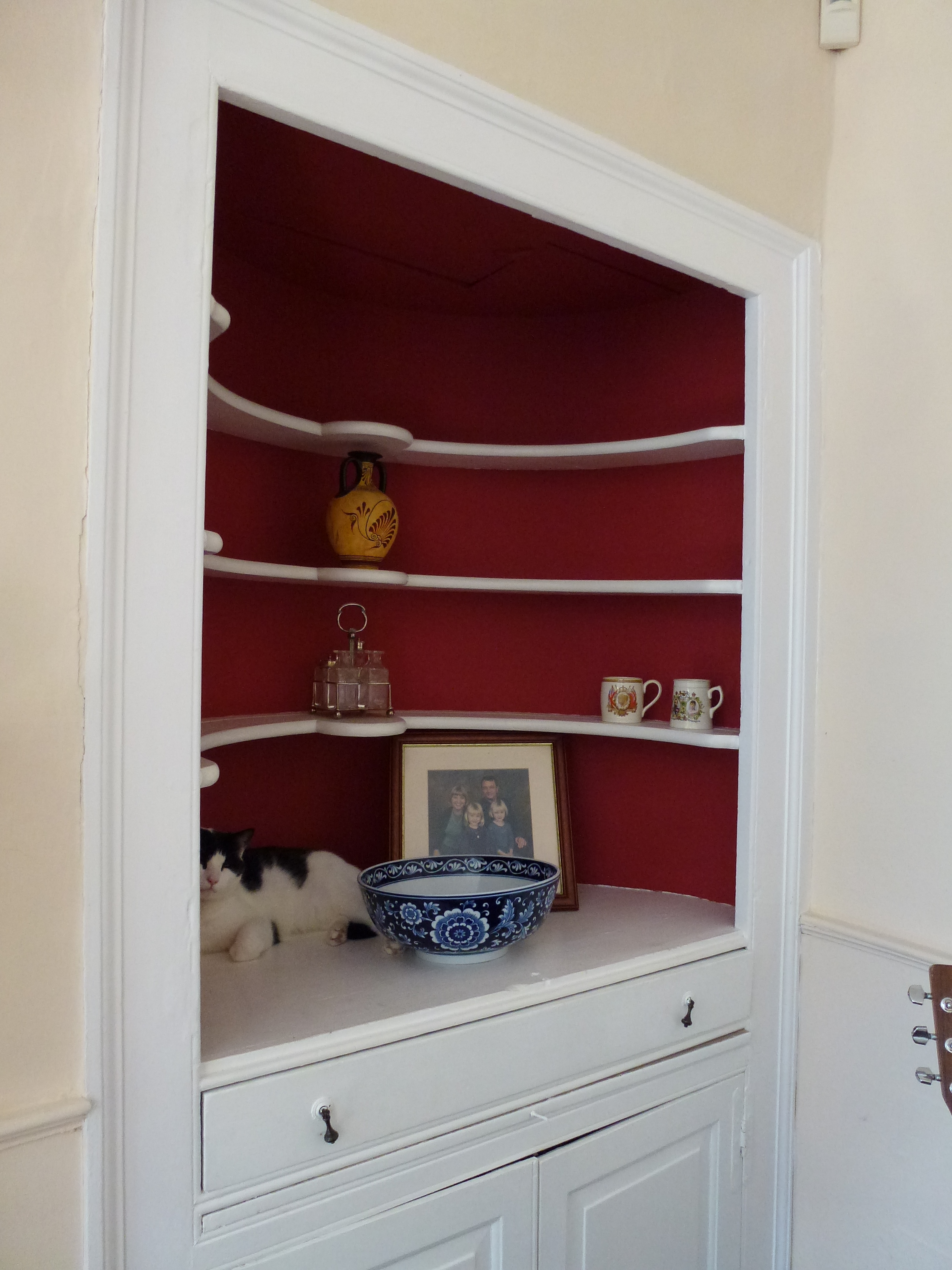 We’ve put various things into the circular shelving, mostly to see what works and what doesn’t: not at all sure that we’ve picked the right things yet. Glass doesn’t seem to work as well as china, but it needs to be things that can be viewed well from the side rather than from the top. Charlie the cat feels that this is a good place to sleep. We’ve taken up the carpet that was in the room and have put down a rug that had been in our attic for years. The sofa on the right is an old sofabed, with throws on it to disguise it. This is the room that we will work hardest on, but part of the work will be to find out what the panelling is like, and we may have to lift the floorboards, check the joists, reapply the woodworm treatment and re-lay the floorboards. Not sure what the ceiling should be like and whether plaster mouldings would have been de riguer in 1737.