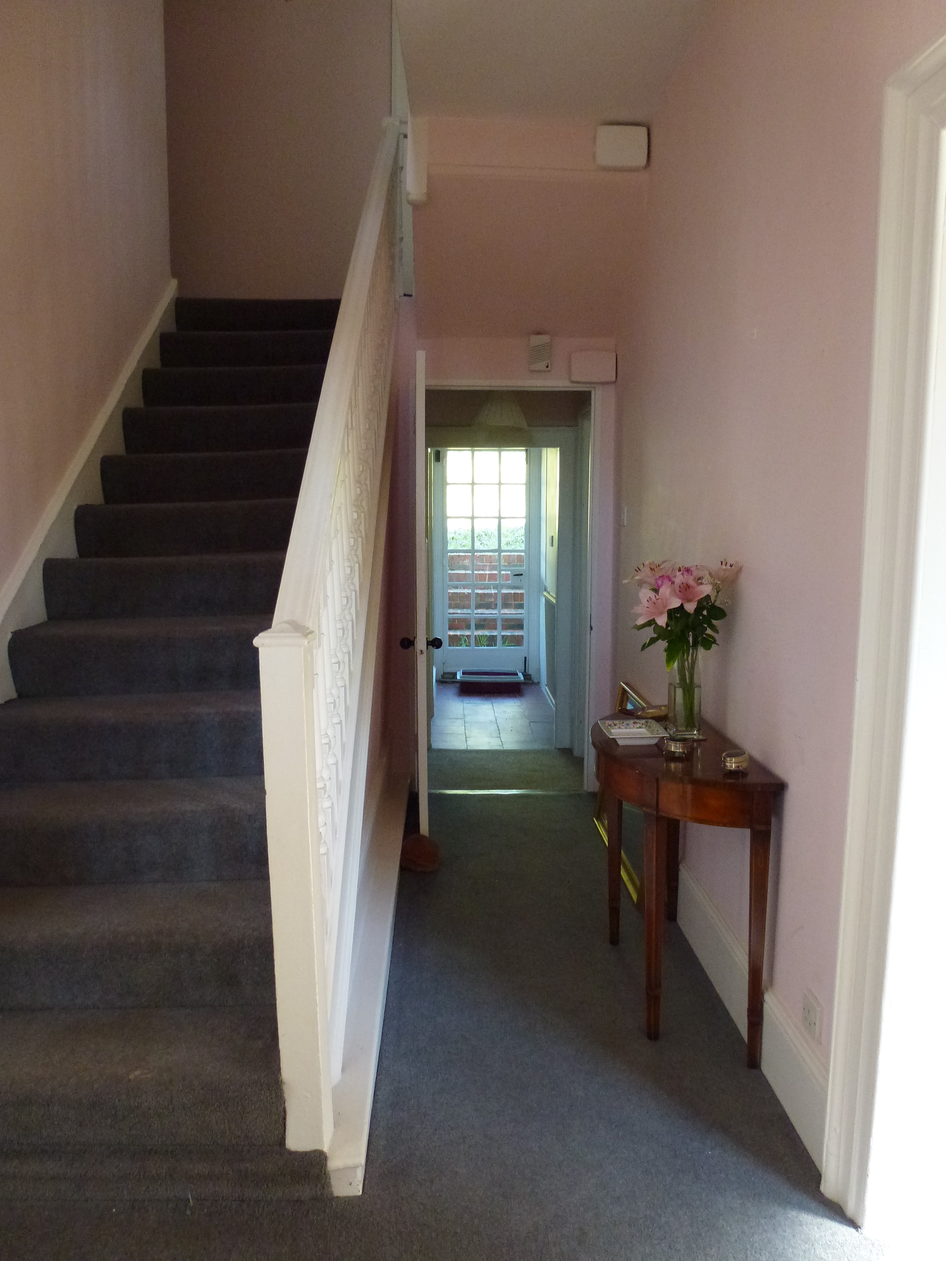 But as you come in through the door, this is what you see: the staircase going up and the corridor going ahead to the back door and to the back