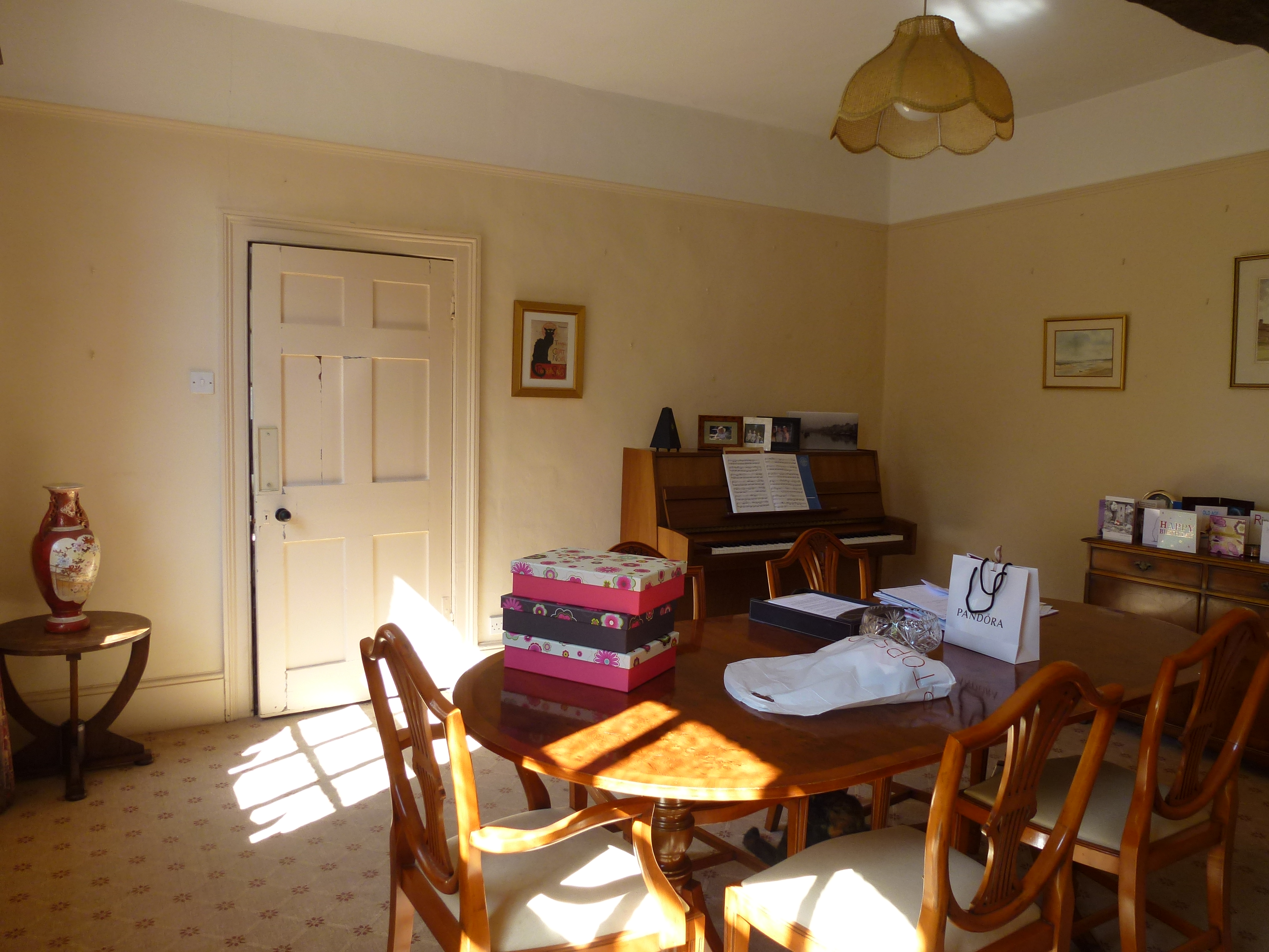 The piano likes it here: the acoustics seem to work, and the floor is relatively even there, and the sun doesn’t really get to it. You can see my clutter, where I’ve been going through all the paperwork to steadily change our address. The Pandora bag is Liz’s 20th birthday present, a pretty bracelet.The cupboards in the room are fascinating, and so far we haven’t started to fill them up. The cupboard to the right of the fireplace (as you look at it) has hidden cupboards within it: the Georgians must have been very twitchy about keeping things safe, or maybe hiding things from the servants. Not sure which.