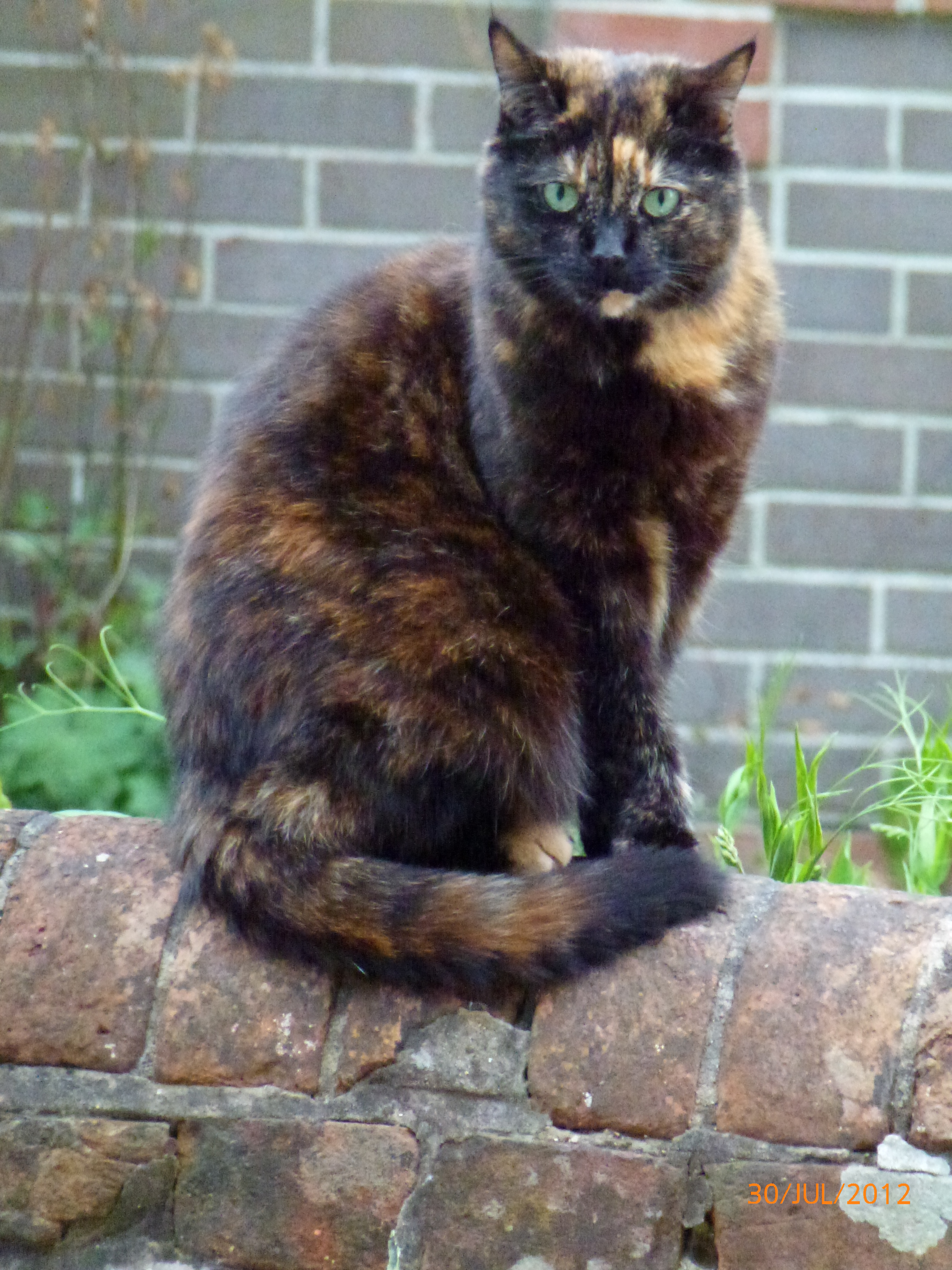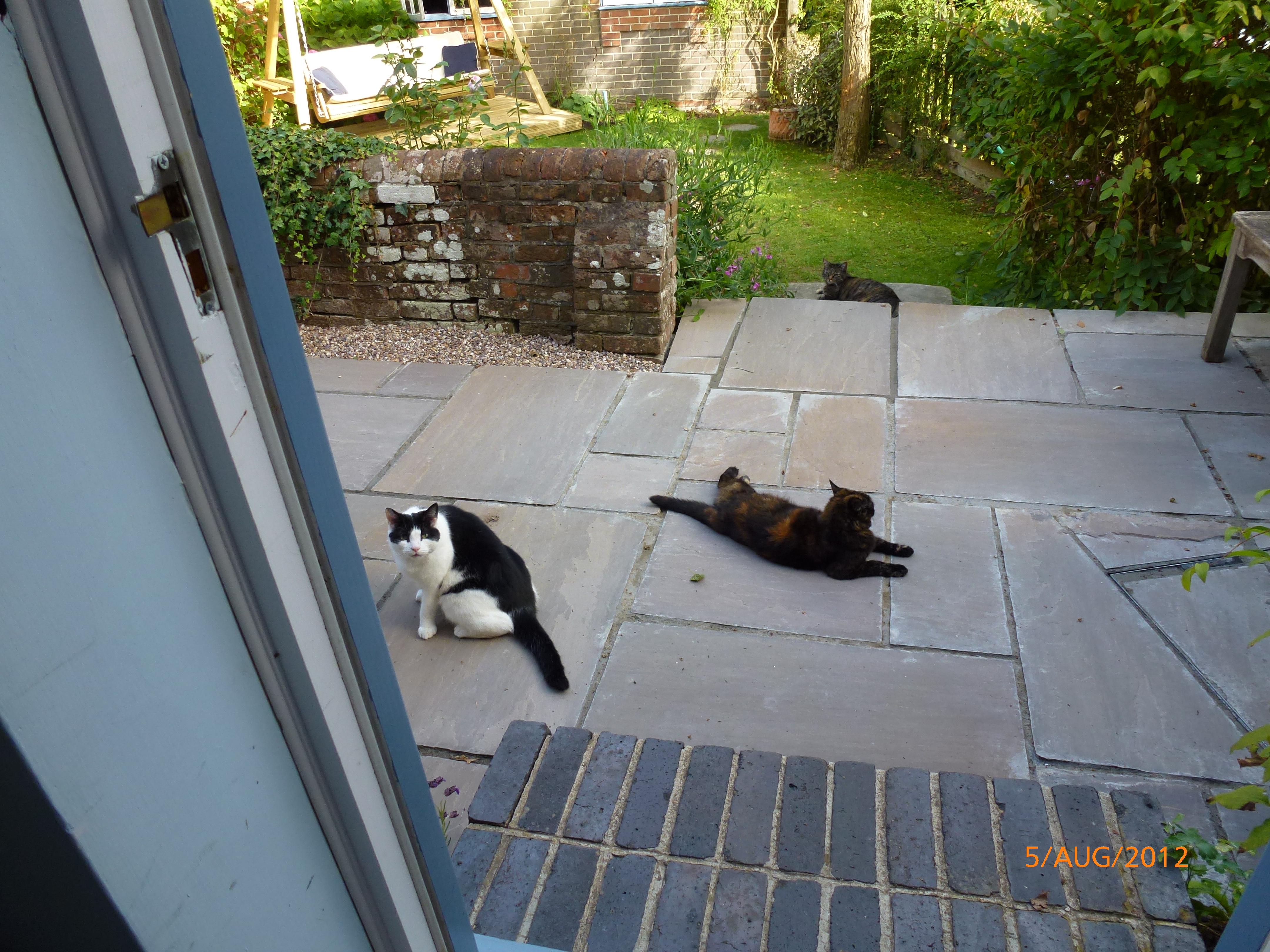 Generally, though, they are all being very good with one another. They accept that each has a right to be there, and there has been no ganging up or taking of sides. A couple of other cats have strayed into the garden at times, and they have been seen off very quickly: but other than a few harsh words at times, there has been little aggression here. At night all four are kept in: so far I think there have only been half a dozen occasions when one or more cats have failed to come in when called. We haven’t ever had to get up in the night to break up any fights (or been startled from sleep!) Here they are on the patio (newly laid) outside the kitchen door.