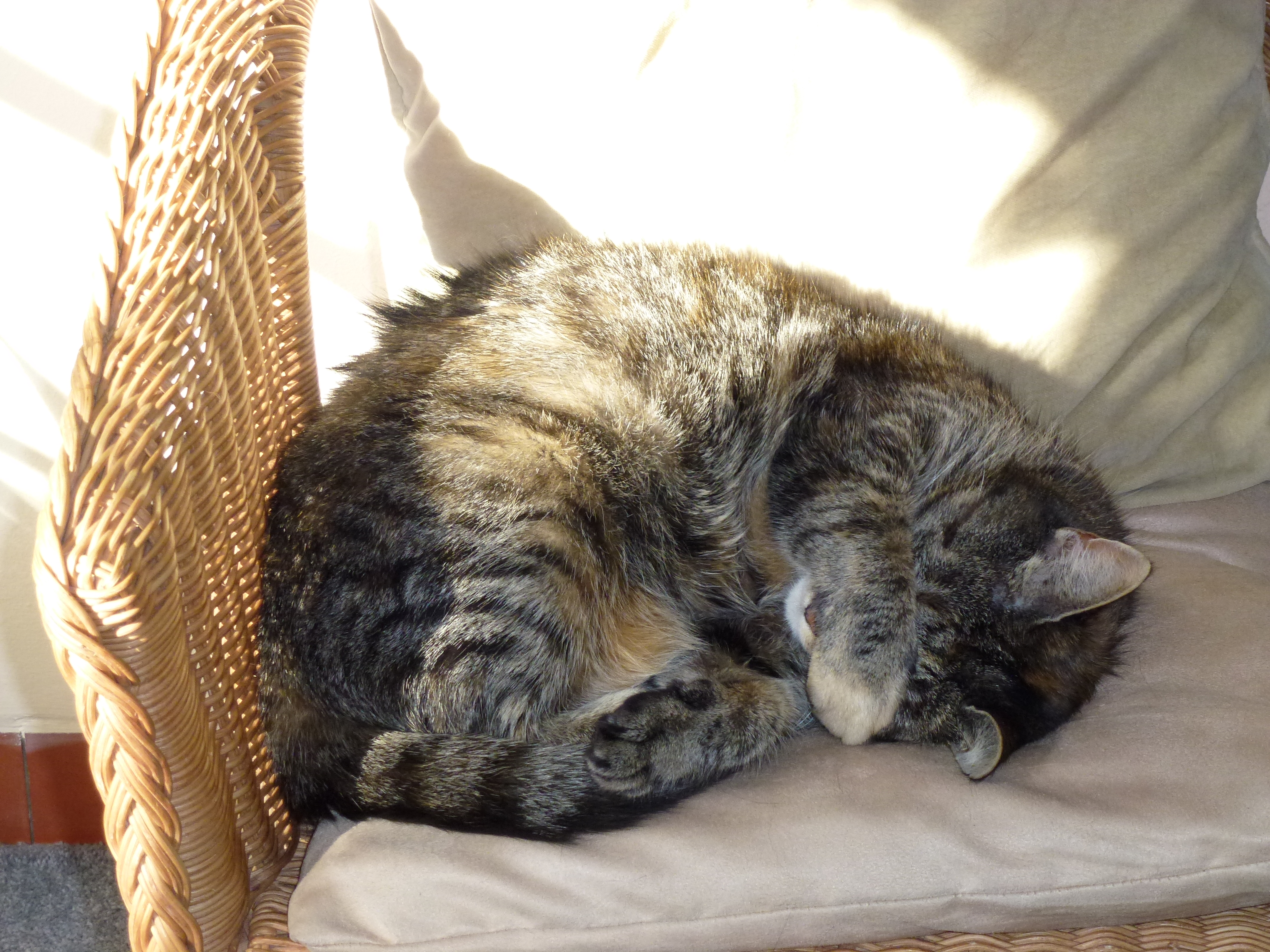 Cleo tends to lurk, mostly in Liz’s bedroom but sometimes in ours. She is uncomfortable with sharing space with everyone else and is always dominated by Charlie. Every so often she tries to sniff Rose, particularly when Rose is sleeping on the wicker chair: but this usually goes horribly wrong. Cleo then runs for cover. Of the four cats, she is the only one who still wants to use the indoor litter tray even when the doors are all open to the garden (very annoying!)