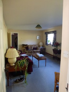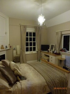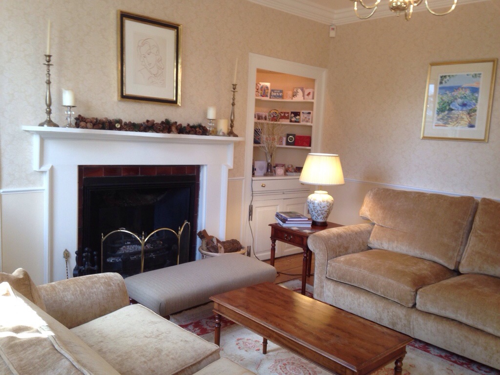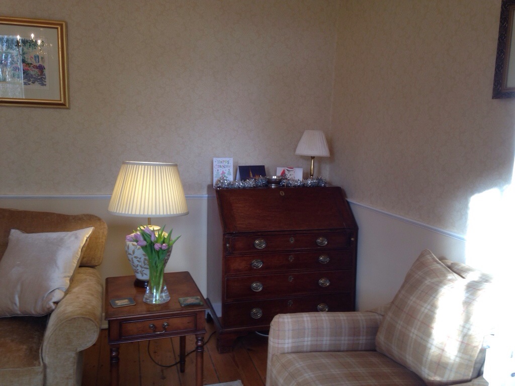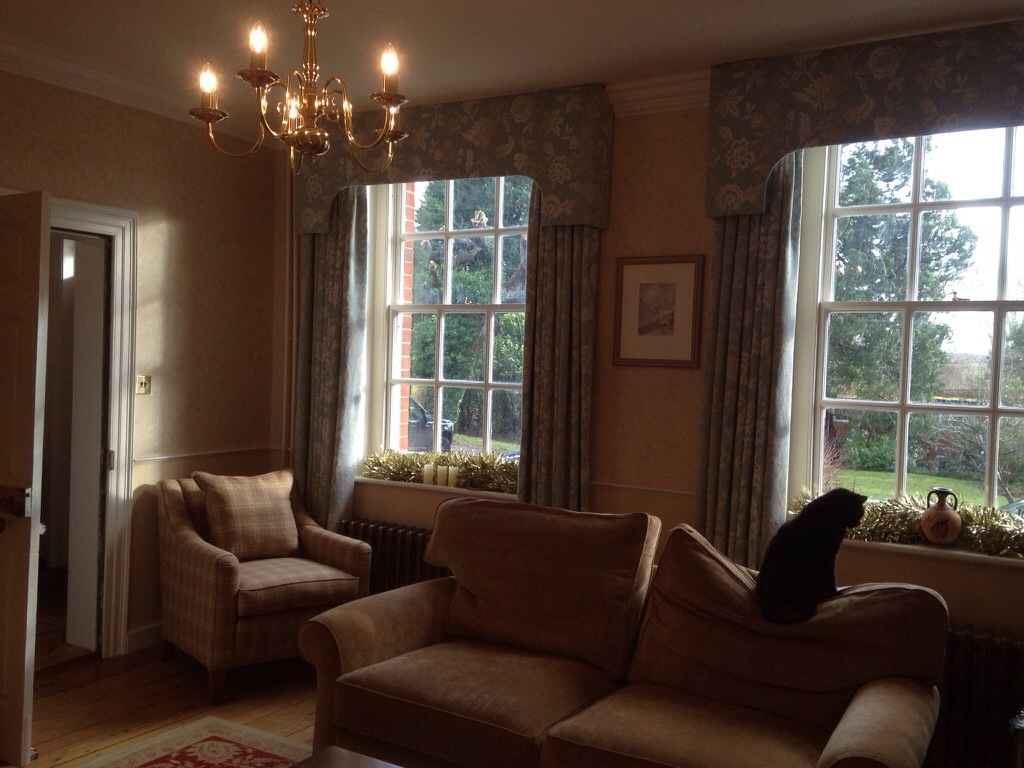 We papered the walls down to the chair rail, and painted below it. The sofas and chairs are new, and the curtains were made to go with the overall colour scheme. Tracie and Lynda of LInteriors in Bucklebury worked tirelessly with us to achieve what we ended up with – a restful, tranquil room, with elegance and dignity but also comfort.